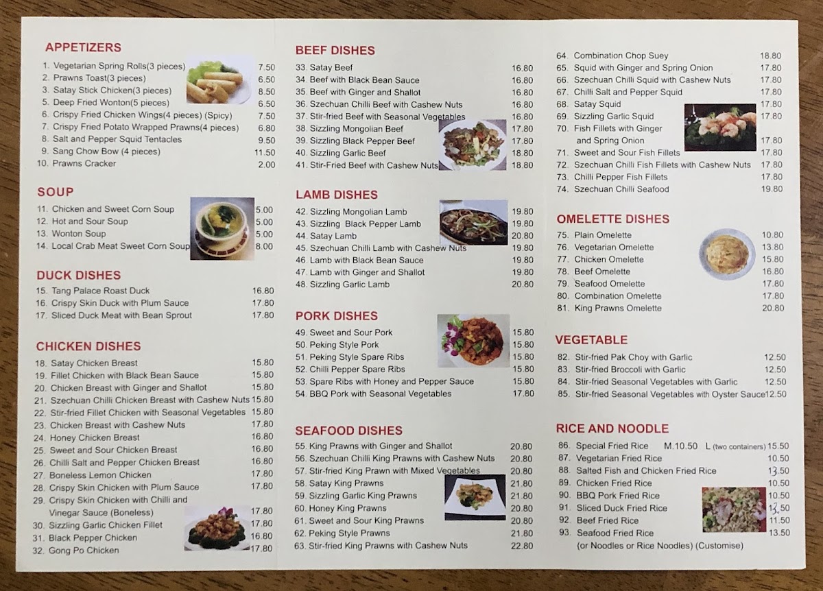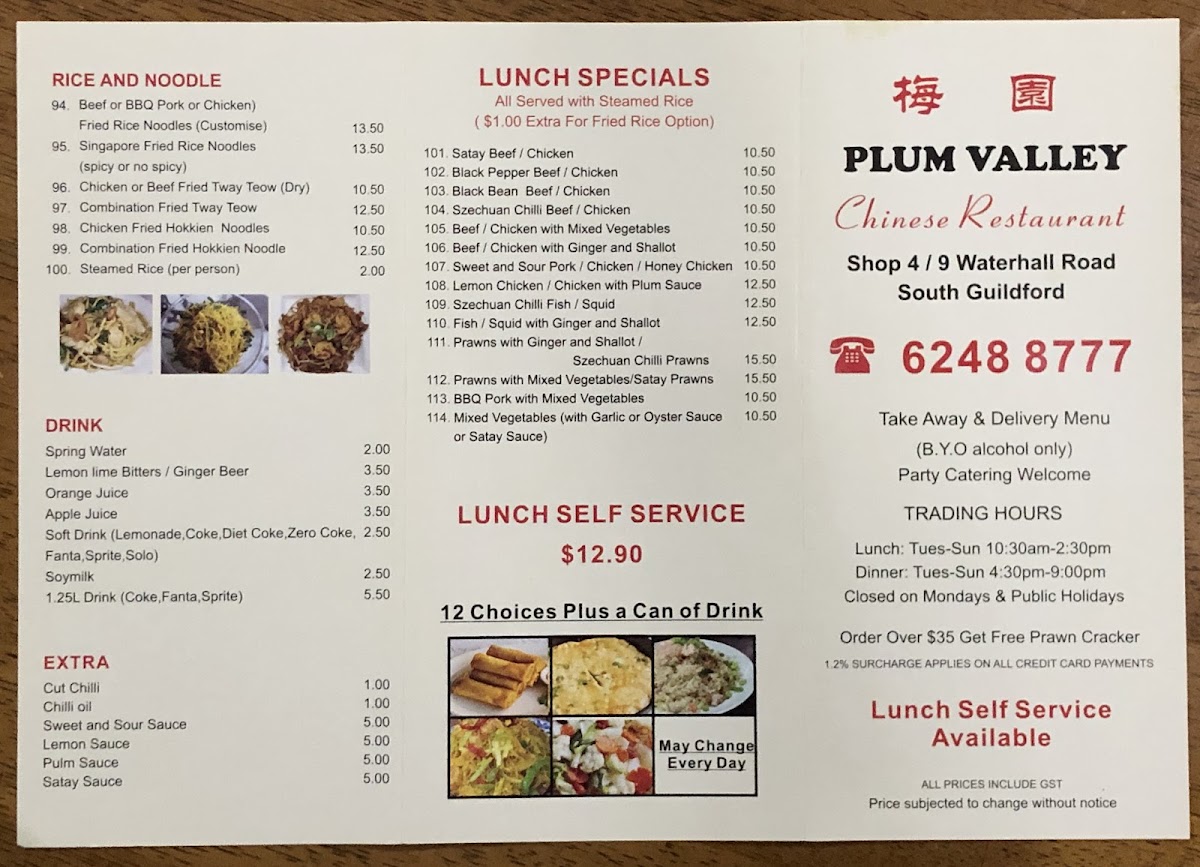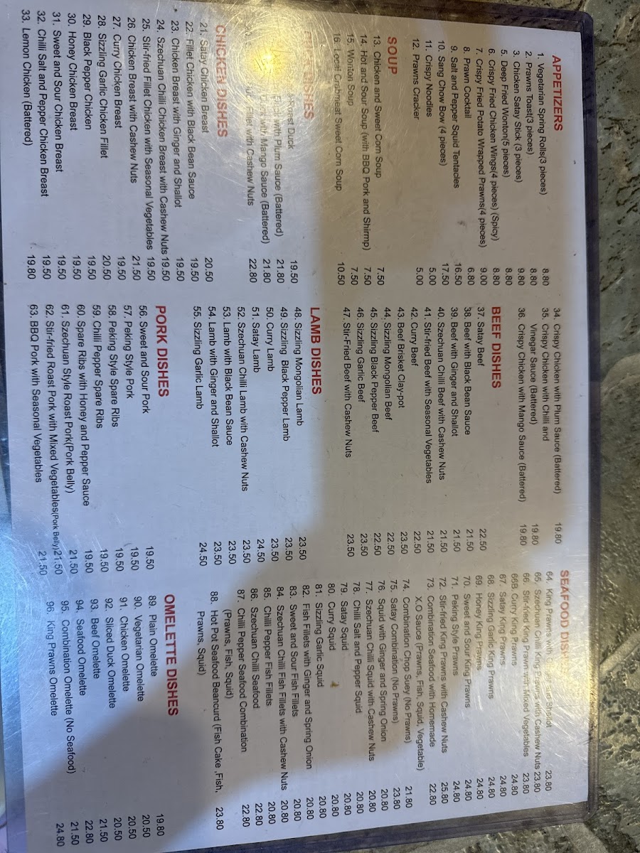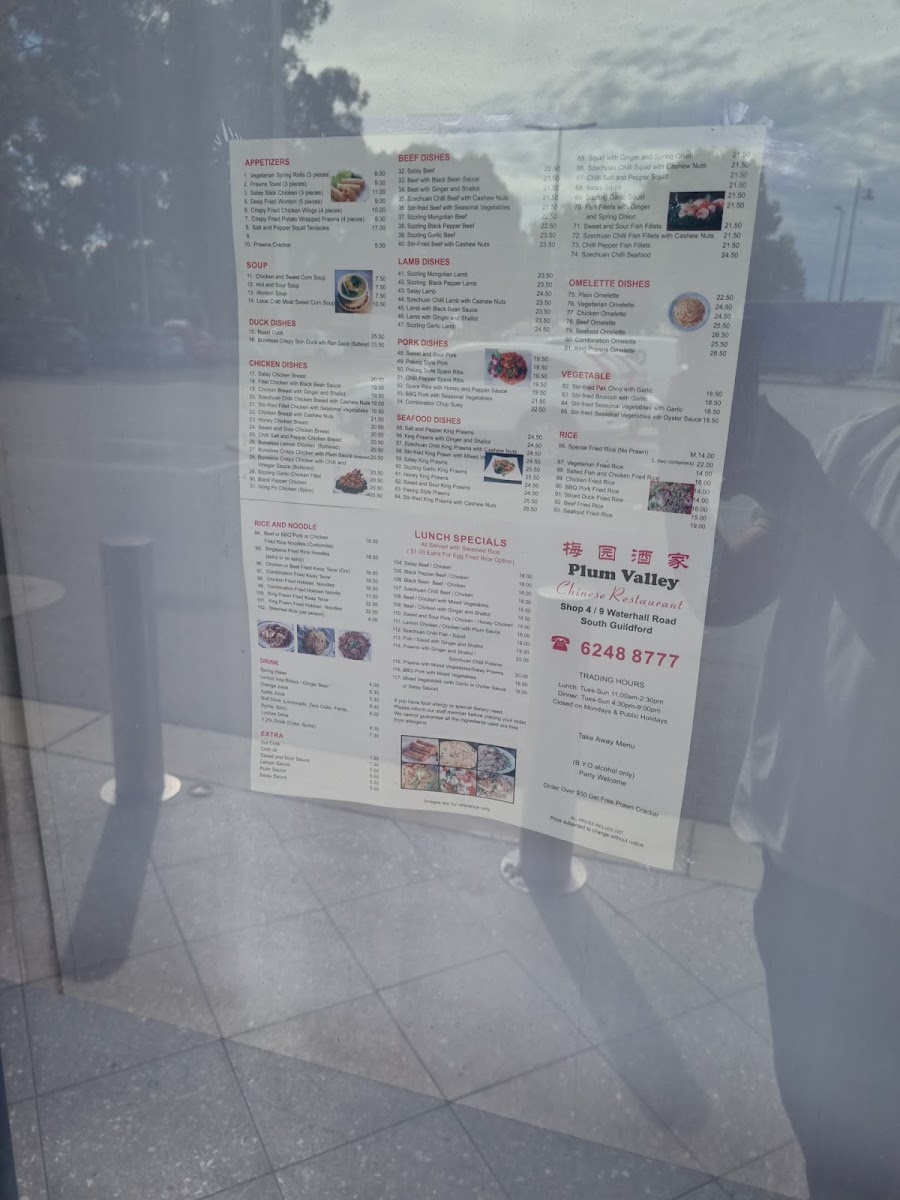 Plum Valley Chinese Restaurant offers a diverse and tantalizing menu, perfect for satisfying various tastes and preferences. For rice and noodle lovers, dishes like Beef Fried Rice and Combination Fried Hokkien Noodle shine, alongside the flavorful Salted Fish & Chicken Fried Rice. Vegetables are well-represented with options such as Stir-Fried Seasonal Vegetables With Garlic and Stir-Fried Bok Choy With Garlic. Seafood enthusiasts can indulge in delights like Sizzling Garlic King Prawns and Szechuan Chilli Seafood, while the Chilli Salt & Pepper Squid and Honey King Prawns add a perfect touch of spice and sweetness. Duck lovers will savor the rich flavors of Crispy Skin Duck With Plum Sauce and Roast Duck. For beef dishes, options like the Sizzling Mongolian Beef and Szechuan Chilli Beef With Cashew Nuts offer bold and savory flavors. Pork dishes such as Chilli Pepper Spare Ribs and Sweet & Sour Pork provide a balance of heat and sweetness. Chicken dishes are equally impressive, with favorites like Kung Pao Chicken and Crispy Skin Chicken With Chilli & Vinegar. For a lighter start, appetizers like Vegetarian Spring Rolls and Prawn Crackers provide tasty options. The restaurant also caters to omelette lovers, offering choices such as the Seafood Omelette and King Prawns Omelette. Lamb dishes like Satay Lamb and Sizzling Black Pepper Lamb will surely satisfy those seeking something heartier. To complement these dishes, the drink menu includes refreshing Ginger Beer and Soft Drinks. Whether you're in the mood for something spicy, savory, or sweet, Plum Valley's menu promises a delightful dining experience.